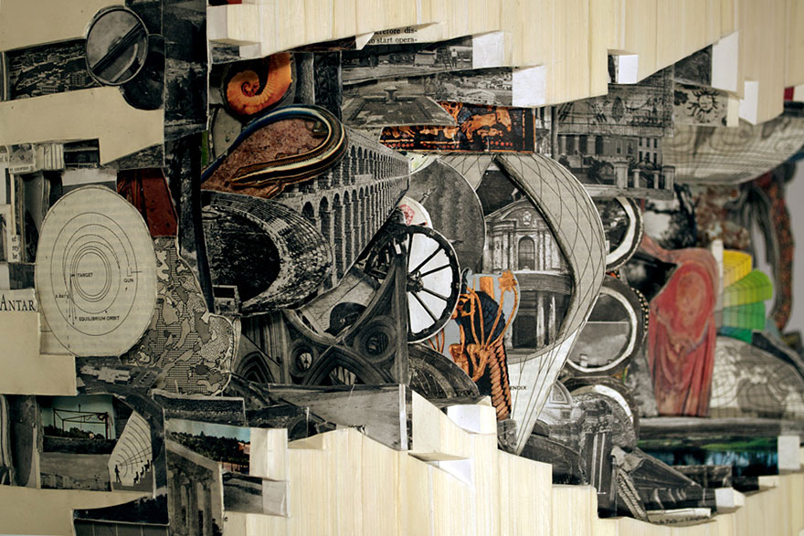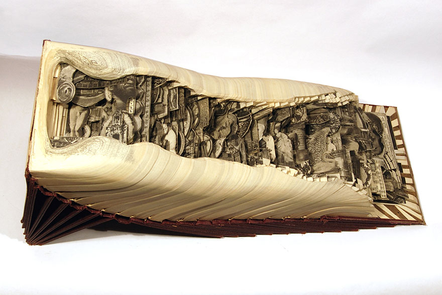 Brian Dettmer è un artista americano con sede a New York, ha la nomea di “Book Surgeon”: manuali, enciclopedie, vecchi libri e qualsiasi altro supporto cartaceo che abbia un grosso spessore passa sotto le grinfie dei suoi attrezzi, che vanno dalle forbici ai taglierini passando per bisturi, pinzette, coltelli e altri strumenti taglienti e di precisione. Il risultato è indubbiamente un colpo d’occhio nonostante, alla fine, il supporto usato venga completamente deteriorato.